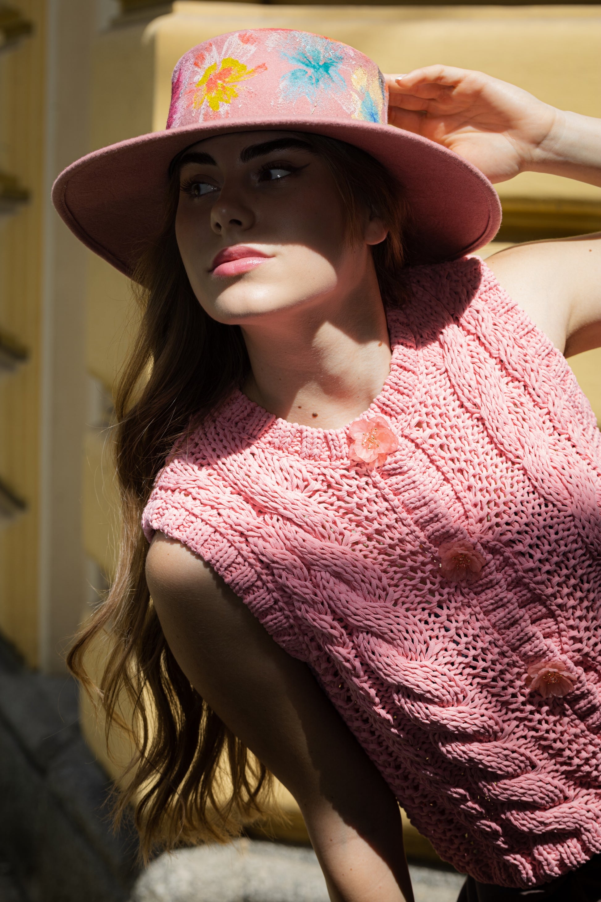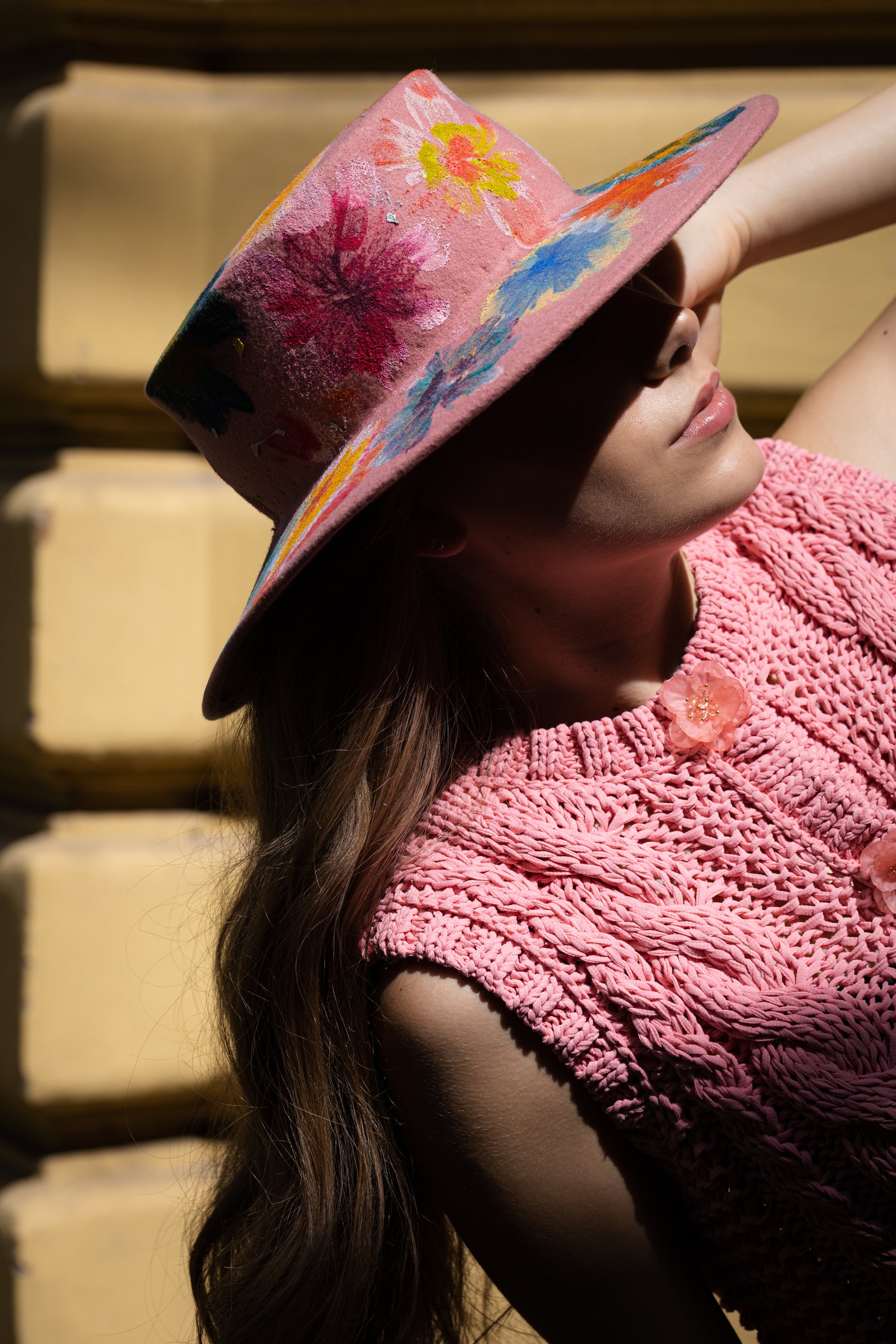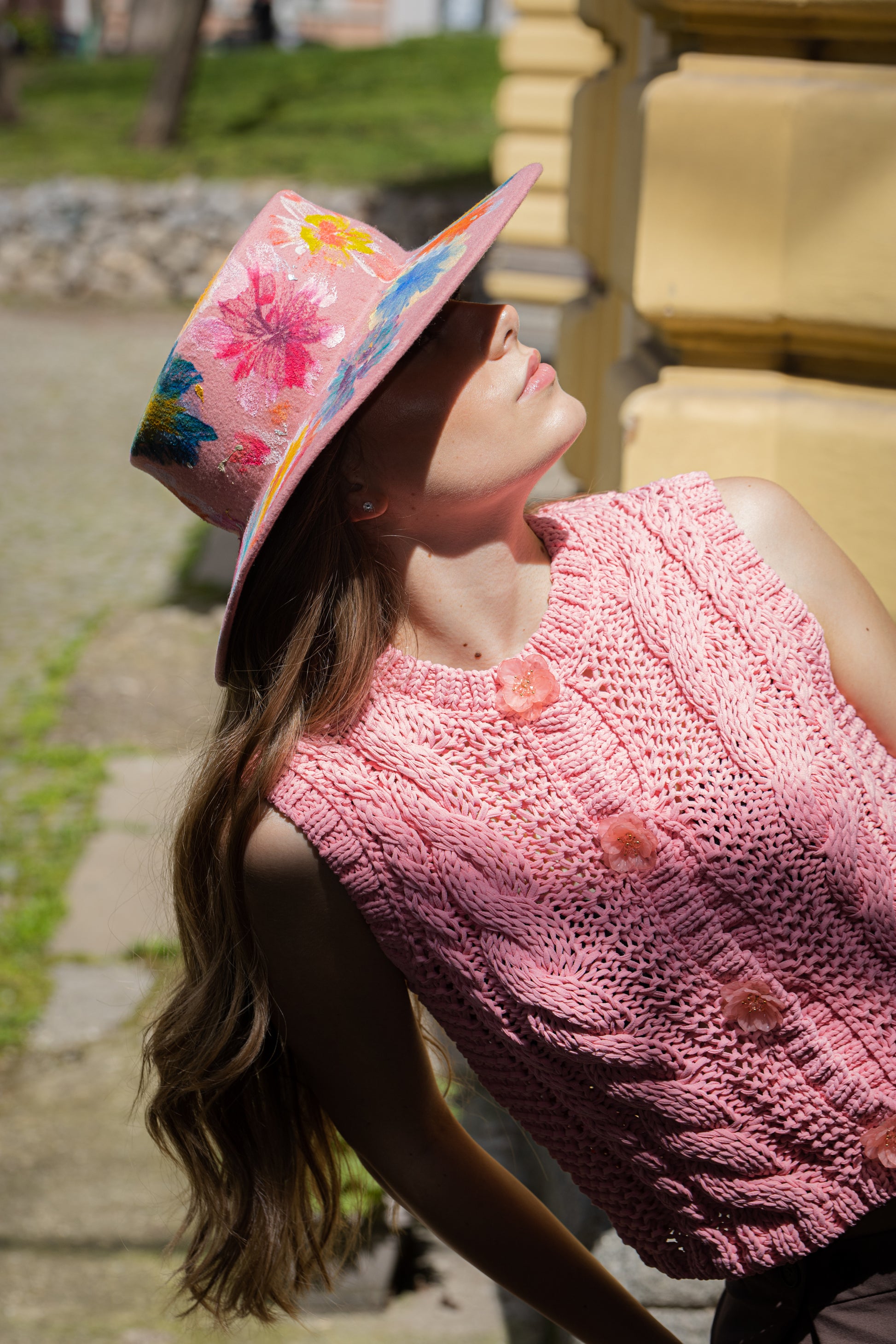 Изкуство, което можеш да носиш – тази ръчно изрисувана федора е ода на пролетта, женствеността и безгрижния бохемски дух. Създадена за онези, които искат да бъдат забелязани, тя съчетава романтика и смелост в едно. Базата от мек розов вълнен филц служи като платно за ярки, живописни цветя, ръчно рисувани с текстилна боя. Всяка щриха ражда радост, светлина и индивидуалност – точно като жената, която я носи. „Blooming“ е съвършеният акцент за фестивали, пътешествия или артистични градски визии.